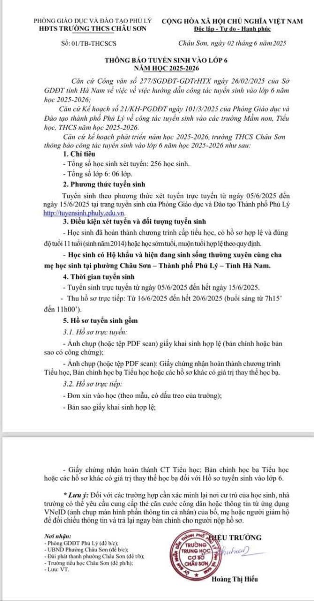 Trường THCS Châu Sơn thông báo kế hoạch tuyển sinh vào lớp 6 như sau: